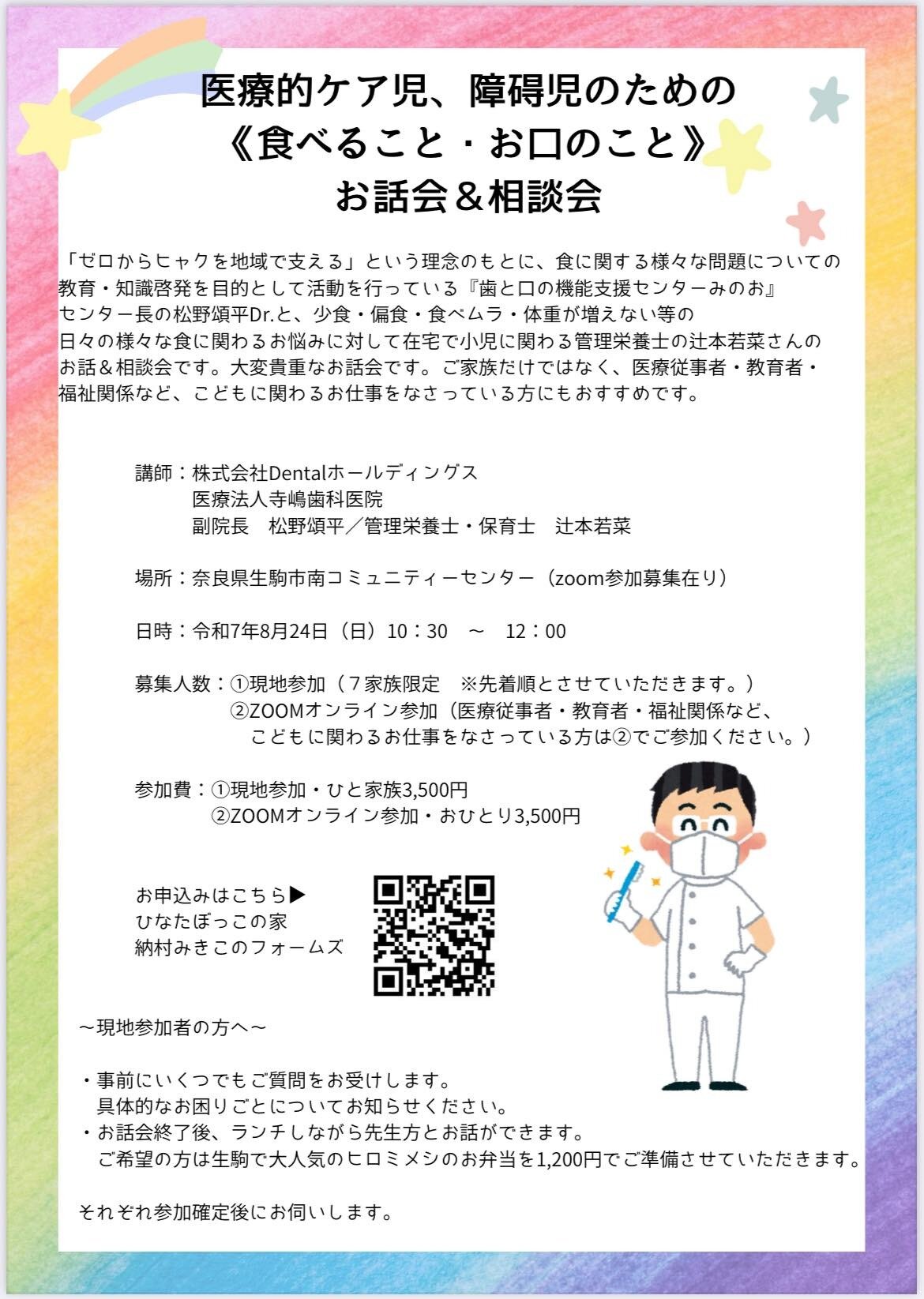 医療的ケア児、障碍児のための《食べること・お口のこと》お話会&相談会 2025.06.23 講演会・セミナー講演会のお知らせ 子どもたちの摂食嚥下、栄養に関するセミナーを開催します。 現地参加は、先着予約で埋まってしまったのですが、オンライン参加も可能ですので、ご興味があれば、是非ともご参加ください。
